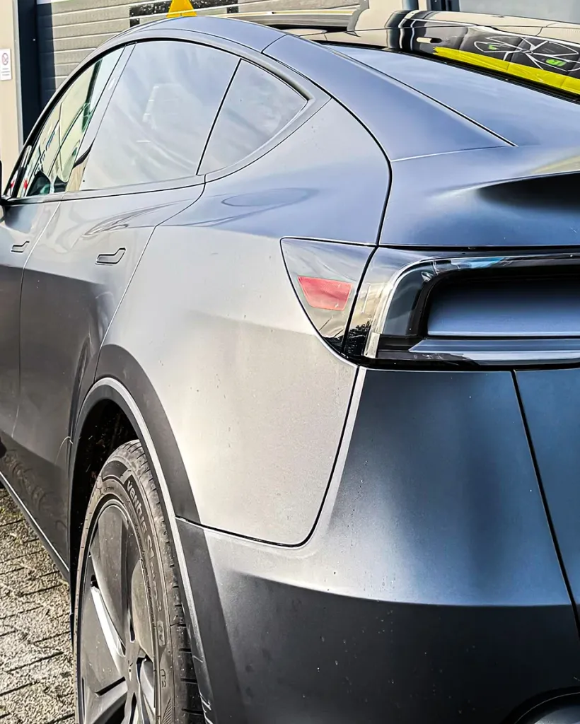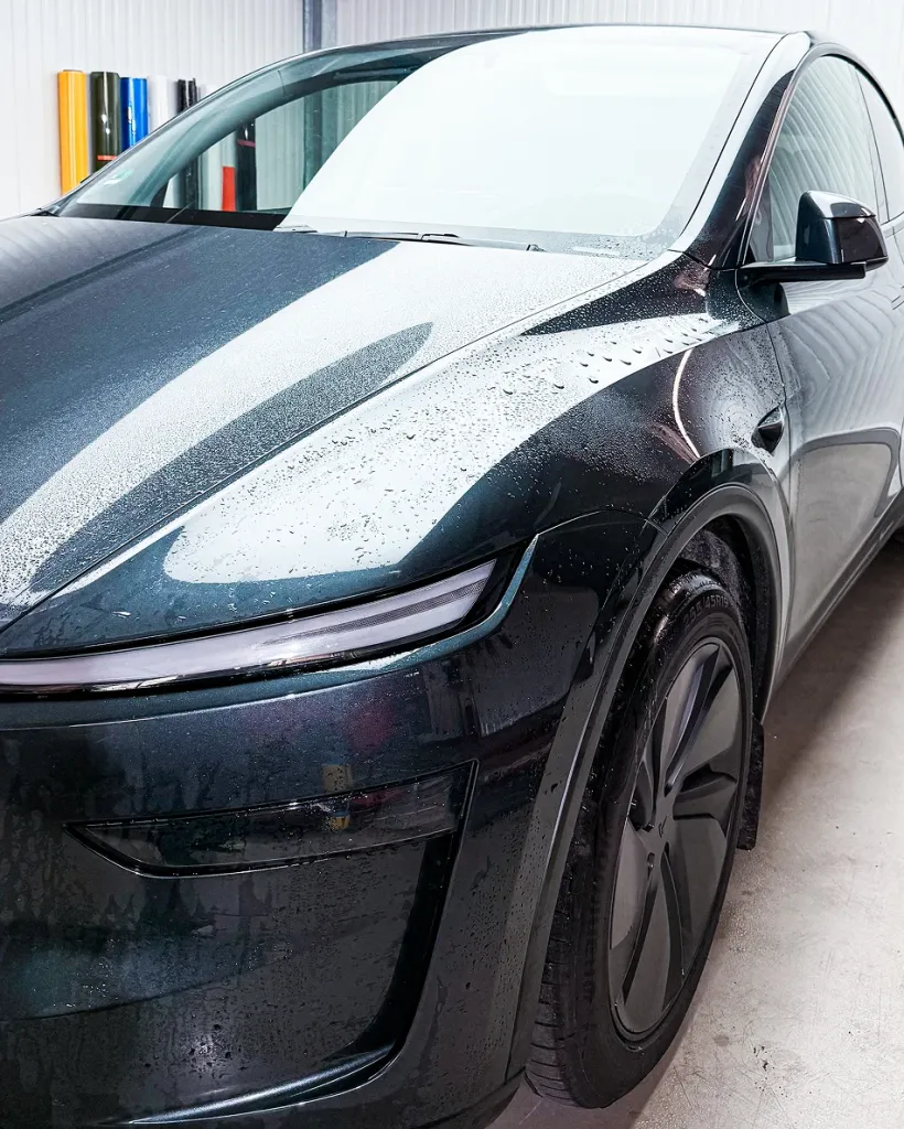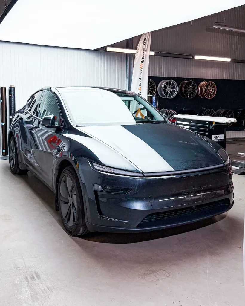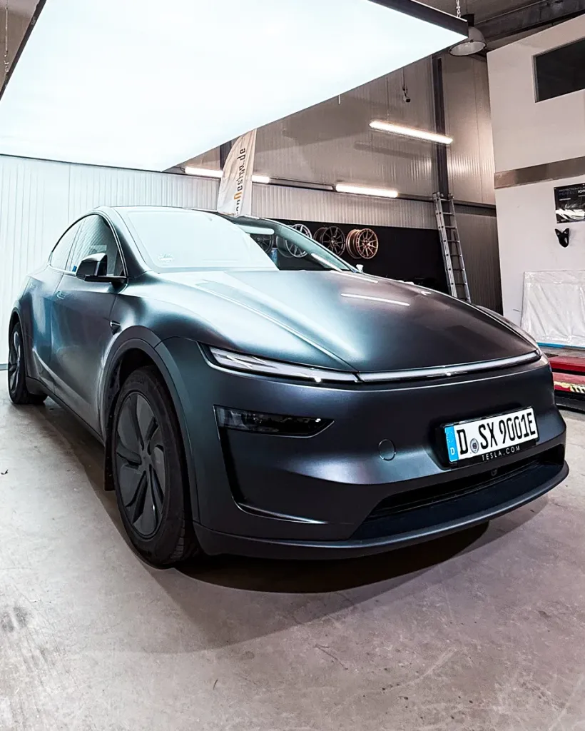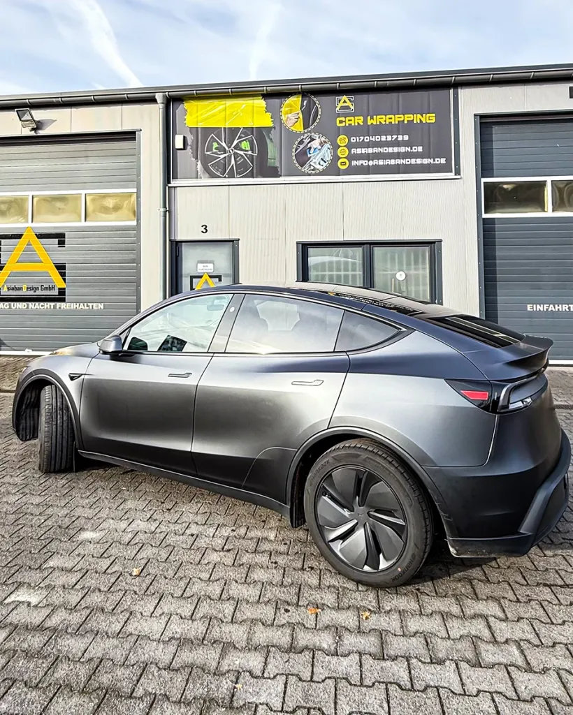 Bei diesem Projekt haben wir den Tesla Model Y (Modelljahr 2025) unseres Kunden vollständig aufgewertet. Das Neufahrzeug wurde rundum mit einer hochwertigen Satin Lackschutzfolie (PPF) versehen, die den Originallack zuverlässig schützt und dem Fahrzeug eine edle, matte Optik verleiht. Die Folierung erfolgte im präzisen Pre-Cut-Verfahren, wodurch keine Fahrzeugteile demontiert werden mussten. Gerade bei einem fabrikneuen Fahrzeug garantiert diese Methode maximale Sicherheit, höchste Passgenauigkeit und den Erhalt des Originalzustands. Der Lack ist dadurch dauerhaft vor Steinschlägen, Kratzern und äußeren Einflüssen geschützt.